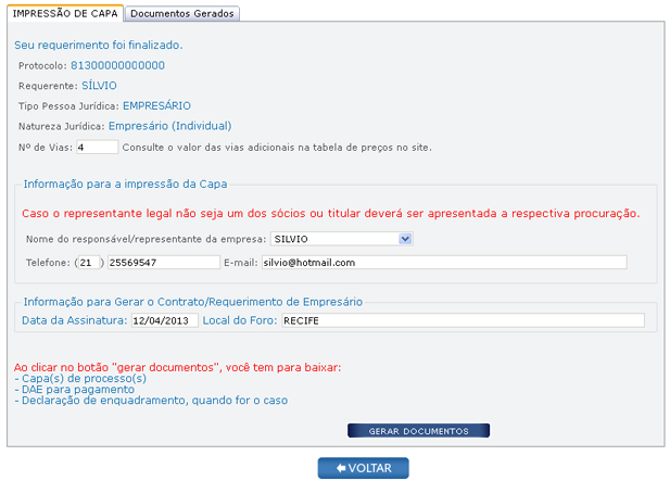 Informe o nome do responsável representante da pessoa jurídica, telefone do representante e e-mail.