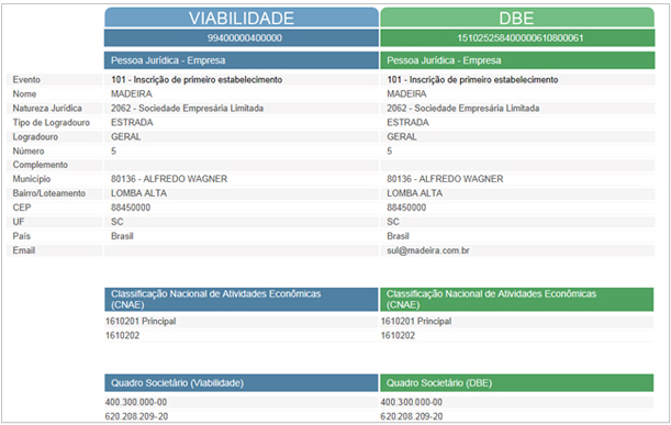 Nesta tela são mostrados os dados existentes na Viabilidade e no DBE da RFB.