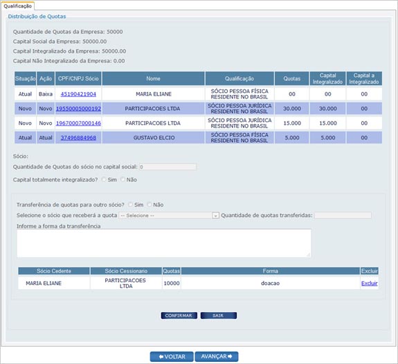 - Selecione o sócio que receberá a quota, quantidade de quotas transferidas e a forma de transferência.