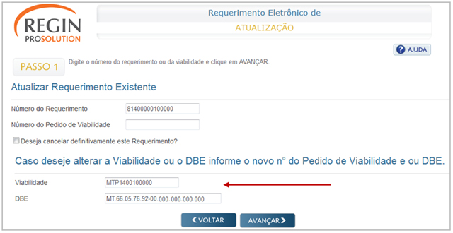 Observação: para atualização do Requerimento de Constituição, caso seja necessário, é possível alterar a Viabilidade ou o DBE após clicar no botão AVANÇAR. Conforme o exemplo abaixo: