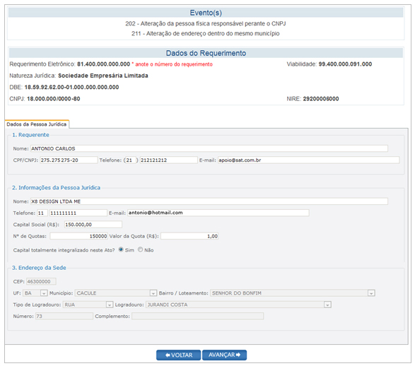 Informe o telefone do requerente, e os outros dados solicitados, e clique em AVANÇAR.