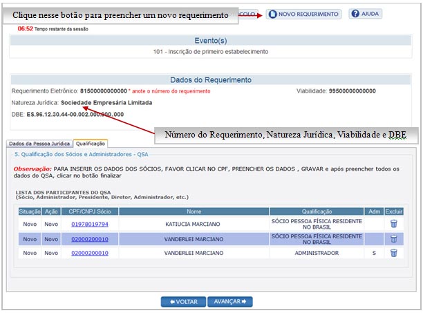 Note que no início da página há um link para gerar um novo requerimento e abaixo deste link há informações importantes como o número do registro, natureza jurídica, Viabilidade e o DBE.