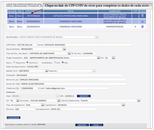 Para preencher as informações sobre a qualificação do quadro dos Sócios e Administradores (QSA), clique no número do CPF/CNPJ de cada sócio na tabela lista de sócios.